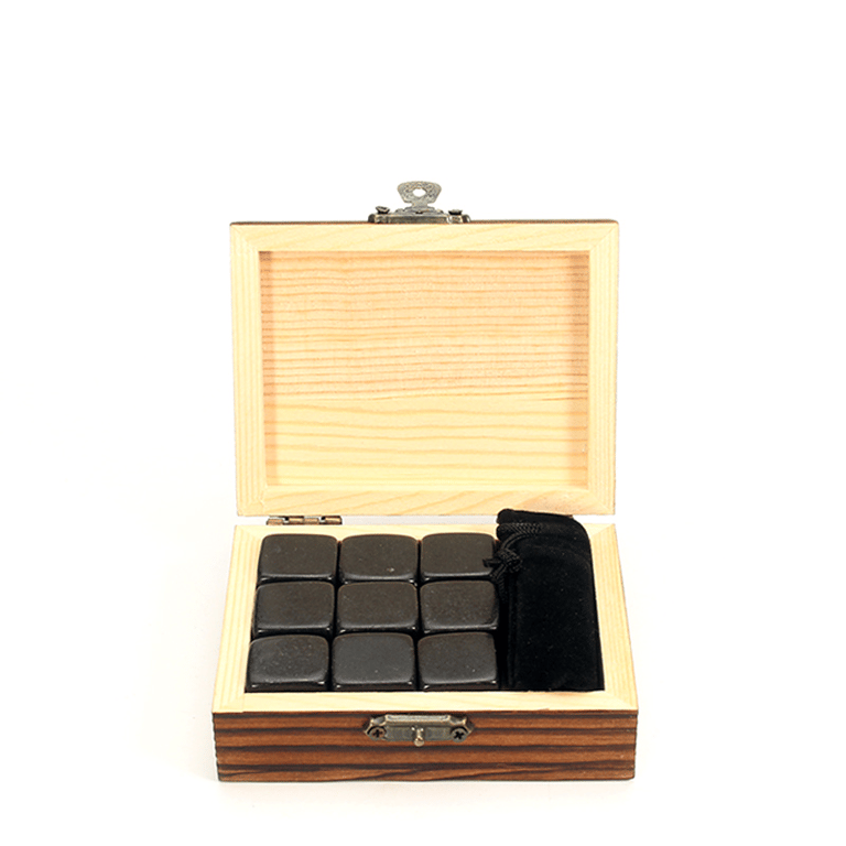 Cubos de granito para enfriar bebidas en una caja de madera de regalo.