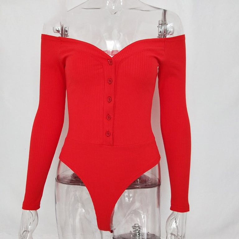 Camisa de mujer ajustada con mangas largas. La camiseta tiene los hombros al descubierto y un escote profundo. En la parte delantera, se cierra con botones. Disponible en varios colores.