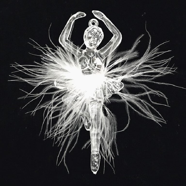 Hermosa bailarina decorativa de material transparente con falda de plumas.