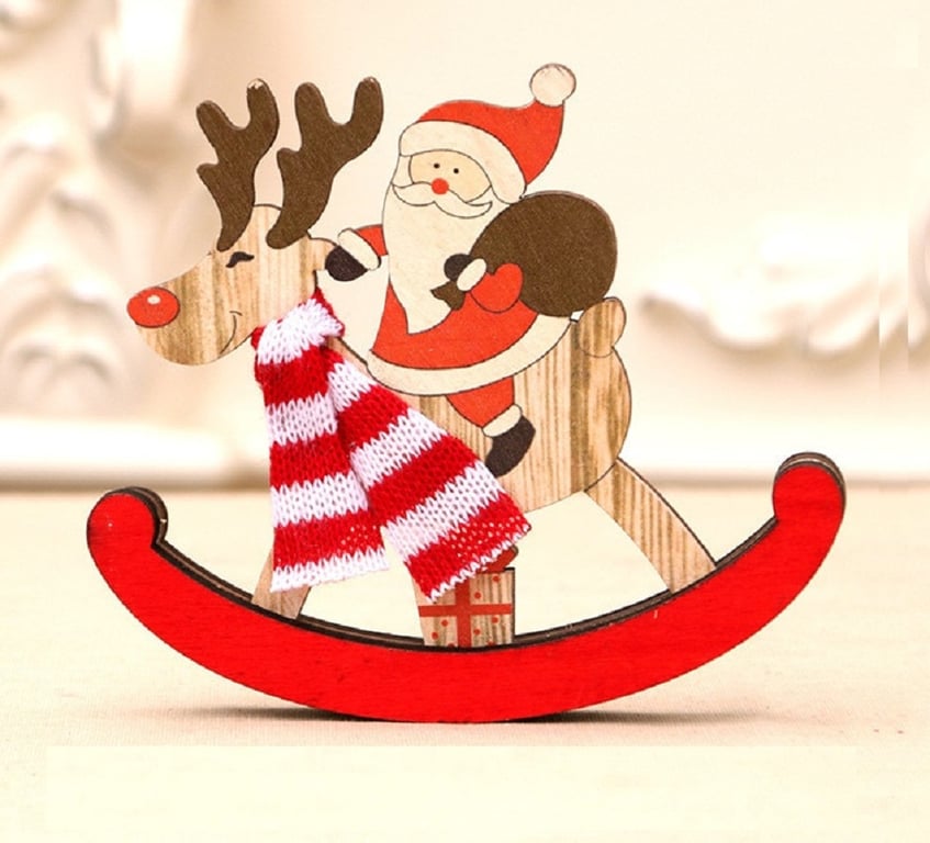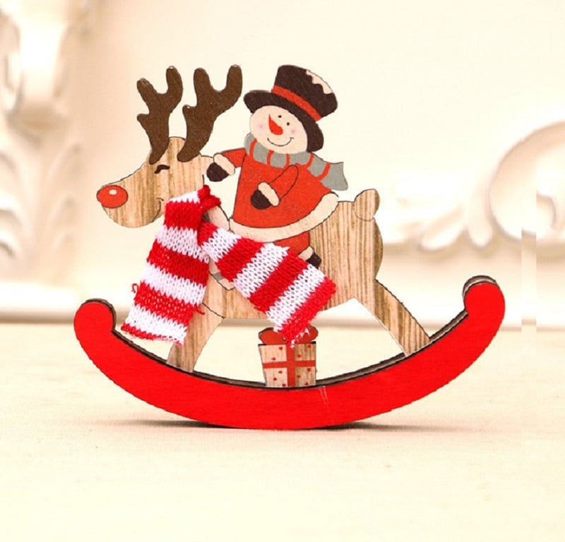 Hermosa decoración de madera: reno mecedor con figura navideña.