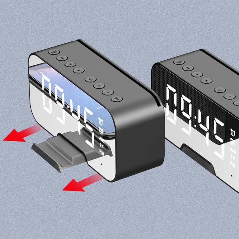 Despertador bluetooth moderno con función de radio y gran pantalla LED. El despertador puede reproducir MP3.