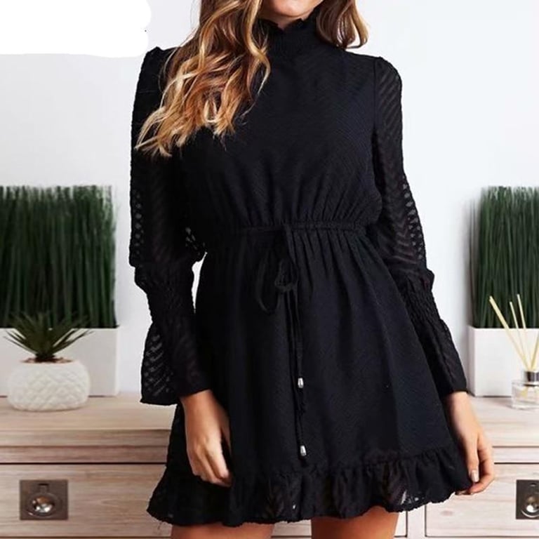 Hermoso vestido de cuello alto en blanco y negro. Con una longitud mini por encima de la rodilla. También se verá genial con medias y pantys. Ideal para el verano, la primavera y el otoño.