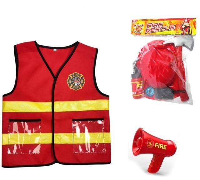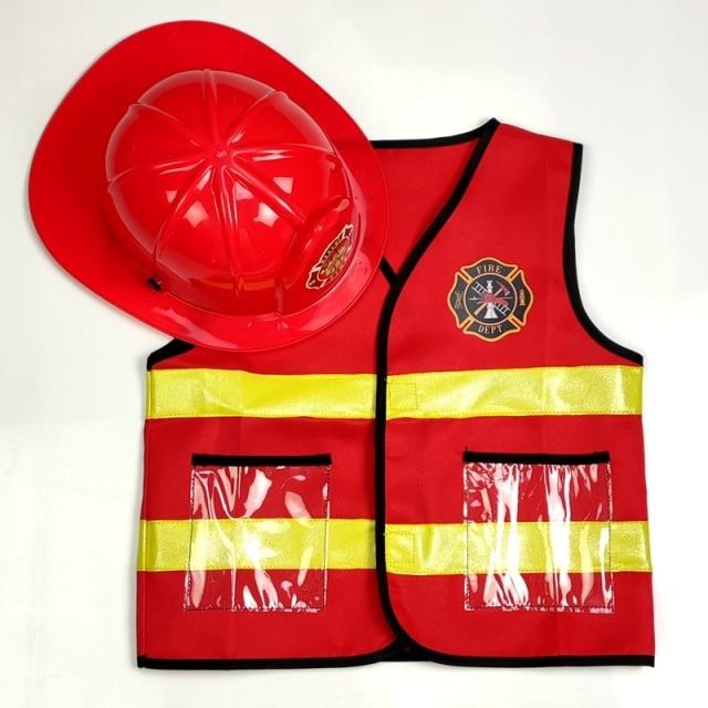 Disfraz de bombero para niños. El disfraz incluye un chaleco, un casco, un martillo, un extintor y una radio. También puedes elegir entre otras opciones, por ejemplo, se puede comprar solo el chaleco.