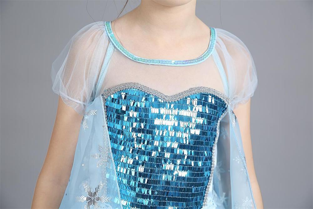 El disfraz está confeccionado en color azul turquesa y está adornado con deslumbrantes lentejuelas y un ribete plateado.