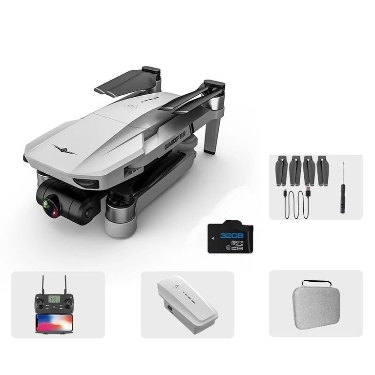 Contenido del paquete: 1x dron, 1x control remoto, 1x soporte para teléfono, 4x hélices de repuesto, 1x destornillador, 1x batería, 1x bolsa para dron, 1x cable USB, 1x tarjeta Micro SD de 32 GB