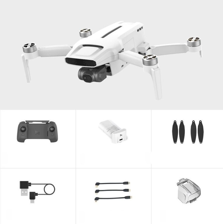Contenido del paquete: 1x dron, 1x control remoto, 1x batería, 4x hélices, 1x cable USB de carga, 4x cable USB, 1x funda para gimbal
