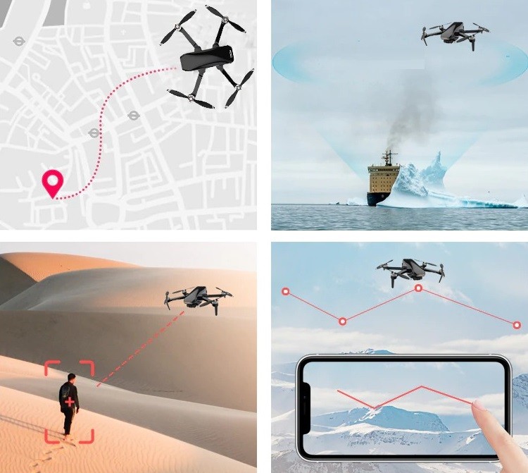 Funciones inteligentes y equipamiento: gimbal de tres ejes, GPS, nivel 7 de resistencia al viento, 5G, zoom 50x, retorno automático con un solo botón, vuelo de punto de ruta, rotación 360°, seguimiento de objetos, autoinicio, aterrizaje automático, modo RTH
