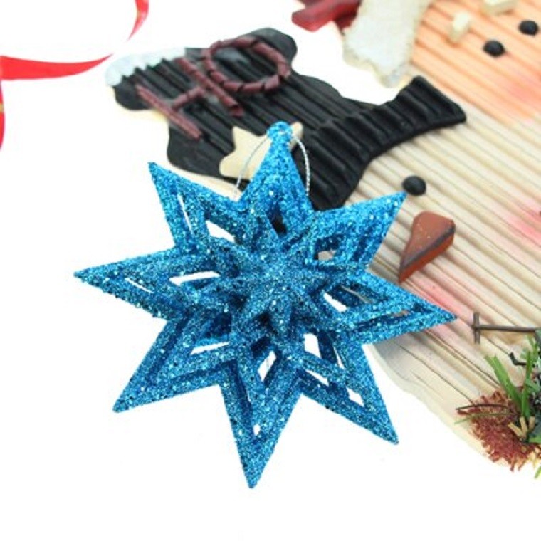 Estrella 3D navideña colgante con superficie brillante de purpurina.