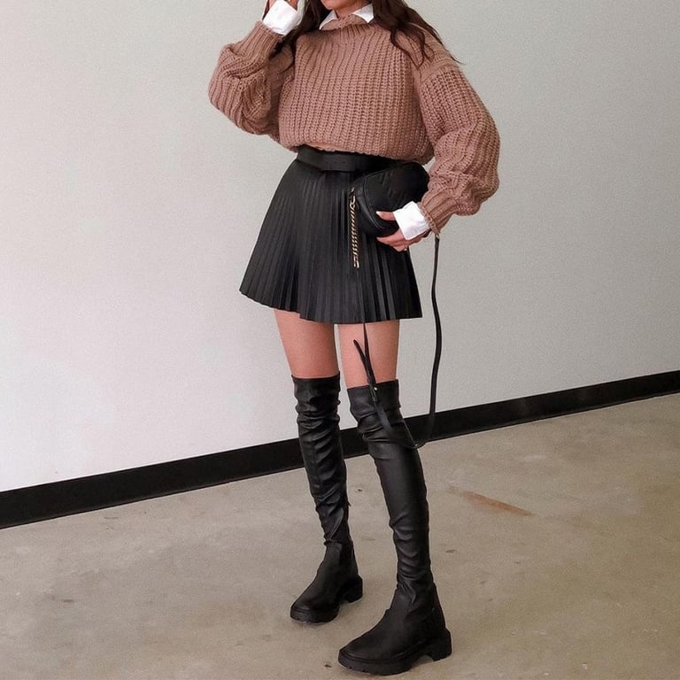 • La falda es plisada y de cuero.