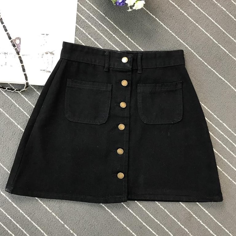 Falda corta de mezclilla para mujer de corte en A. Cierre decorativo con botones en la parte delantera. Disponible en varias opciones de color.
