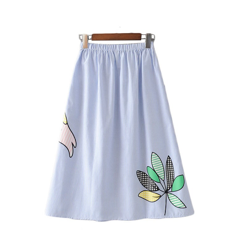 Falda de mujer con estampado colorido. Patrón con finas rayas. Corte amplio en forma de A con cintura elástica.