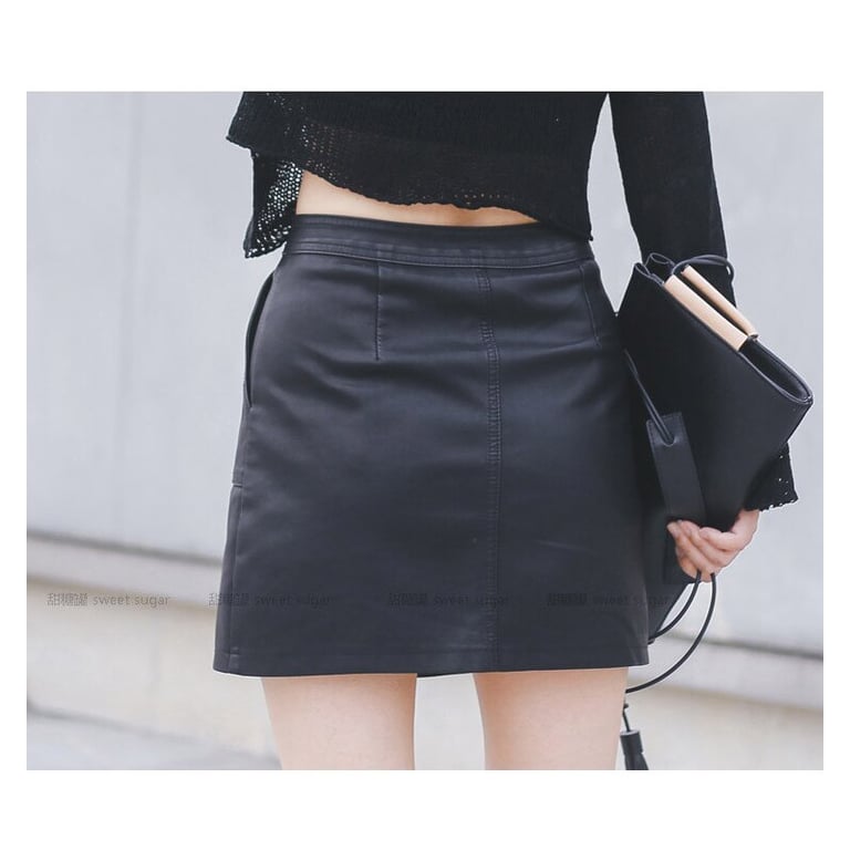 Falda de piel sintética para mujer. Corte corto en forma de A con cintura de altura media. Cierre con cremallera en la parte delantera. Dos bolsillos laterales.