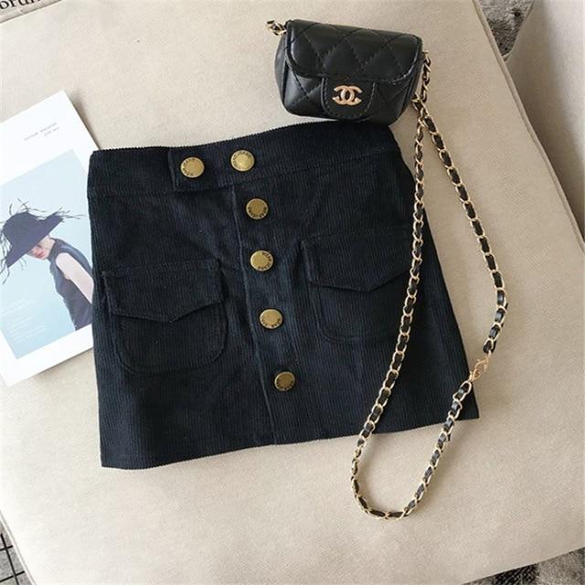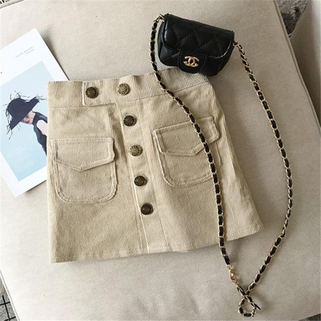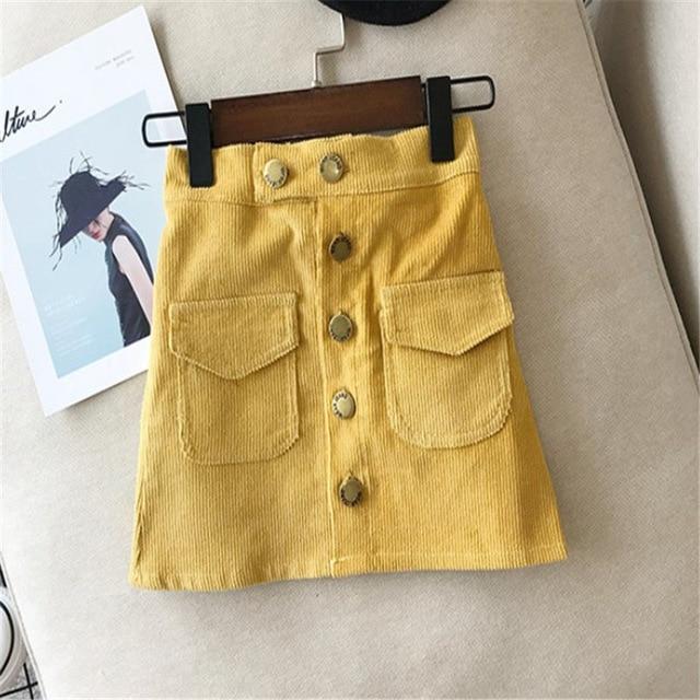 Falda de niña de algodón de corte recto decorada con grandes botones. Cintura elástica para mayor comodidad.