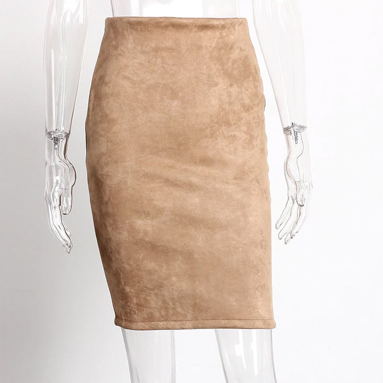 Falda ajustada de aspecto de ante para mujer. La falda tiene una cintura alta y una longitud por encima de la rodilla. Disponible en tres colores.