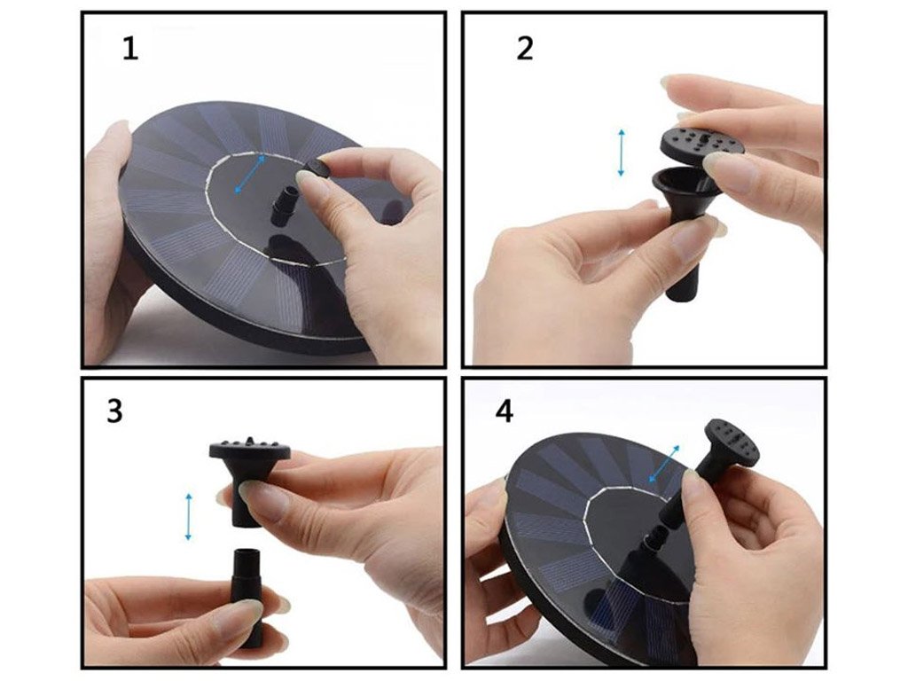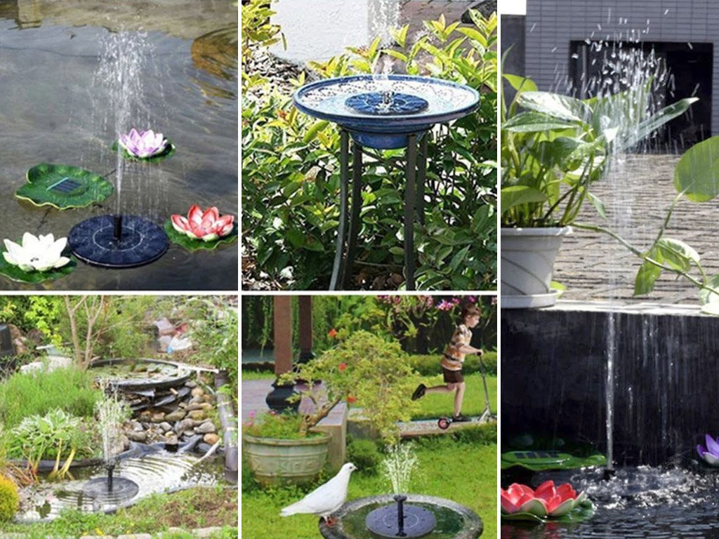 La fuente solar contiene una bomba, que está compuesta por un panel solar de alta eficiencia y una nueva bomba sin escobillas. Simplemente flota en la superficie del agua y no necesita un enchufe eléctrico ni baterías. También sirve como decoración de jardín o ducha para pájaros.