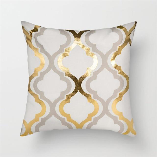 Fundas de cojín originales con ornamentos geométricos en acabado dorado.