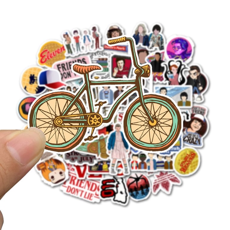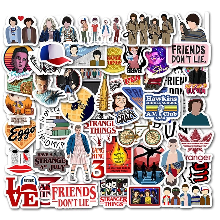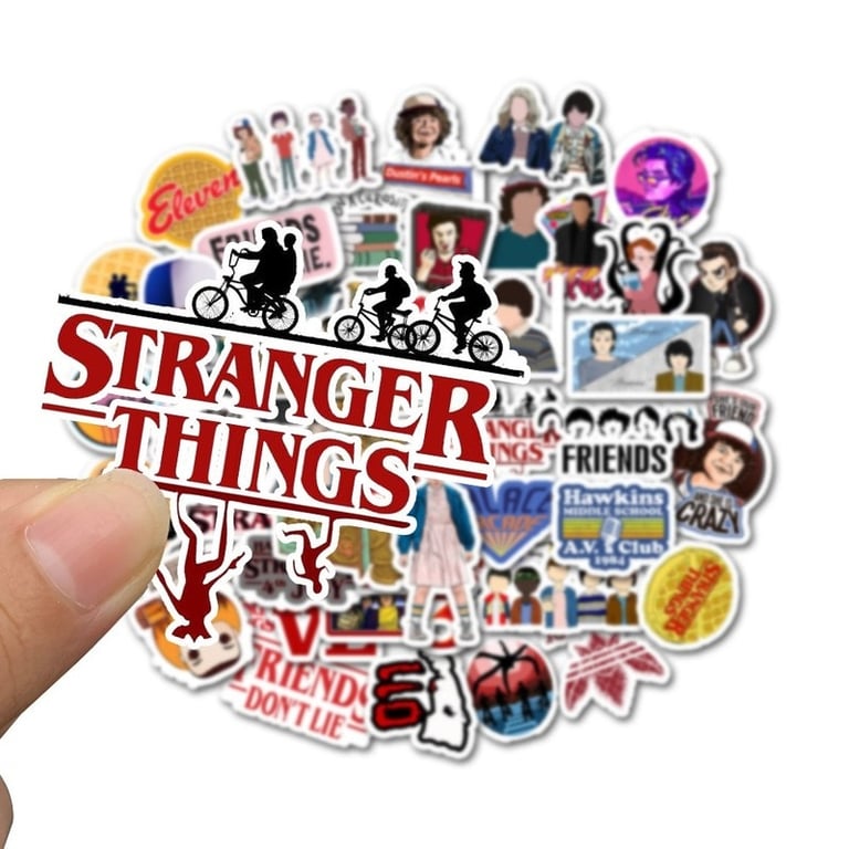 El paquete contiene 50 pegatinas de Stranger Things, cada una con un tamaño diferente. Aquí encontrarás el texto Stranger Things y los personajes principales.