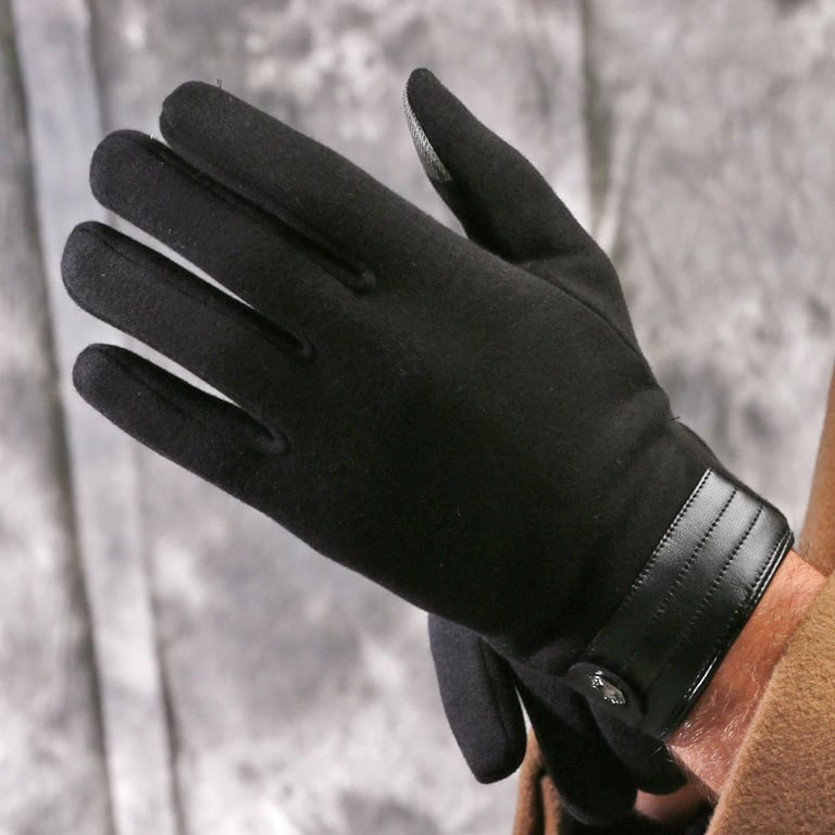 Guantes elegantes para hombre con una correa de aspecto de cuero alrededor de la muñeca. Aislados en el interior con forro de piel sintética.