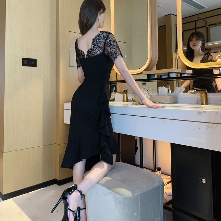 Vestido elegante adornado con encaje en las mangas.
