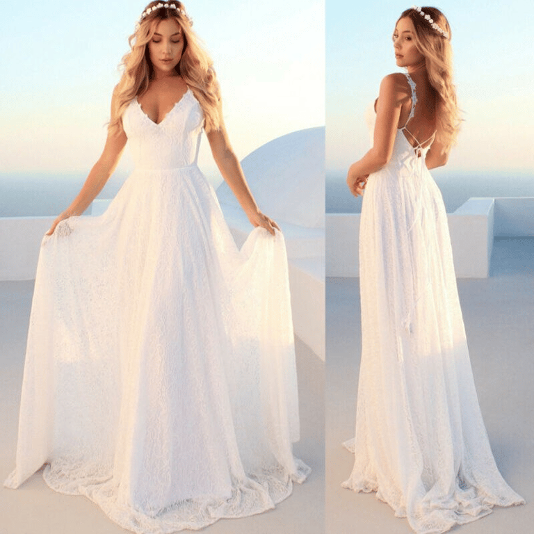 Hermoso vestido de novia de encaje blanco Hirigin con escote profundo
