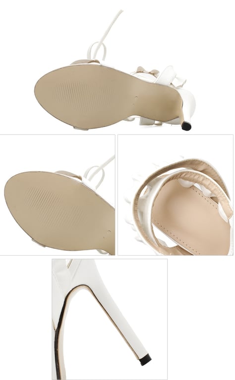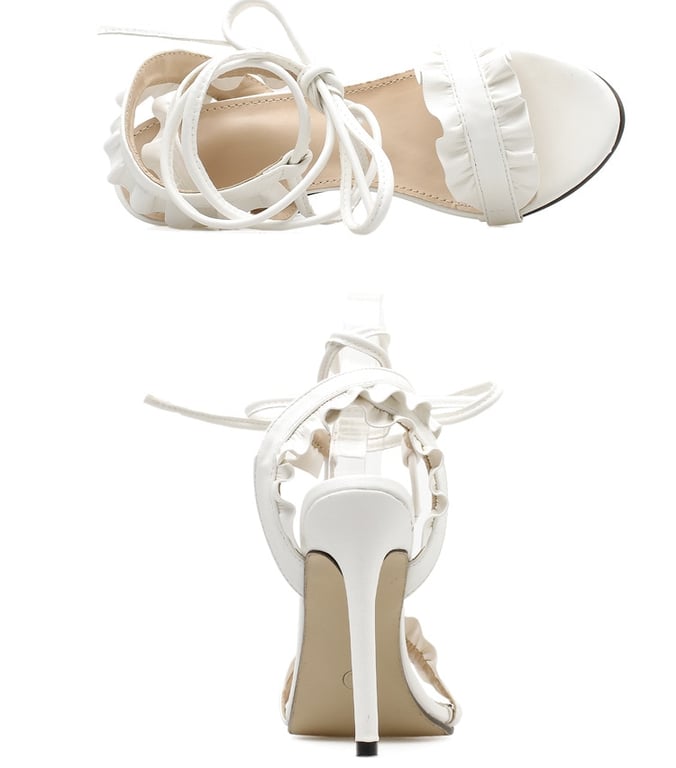 Hermosos sandalias blancas de tacón para mujer con atado y volantes