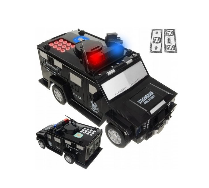 Inspire a sus hijos a tener una relación adecuada con el dinero y a ahorrar. Una hucha en forma de un coche de policía blindado, en la que las monedas y billetes estarán seguros y protegidos por una contraseña.