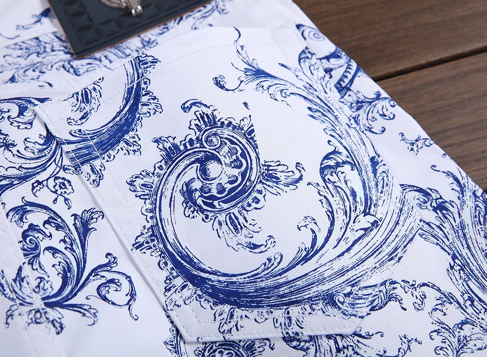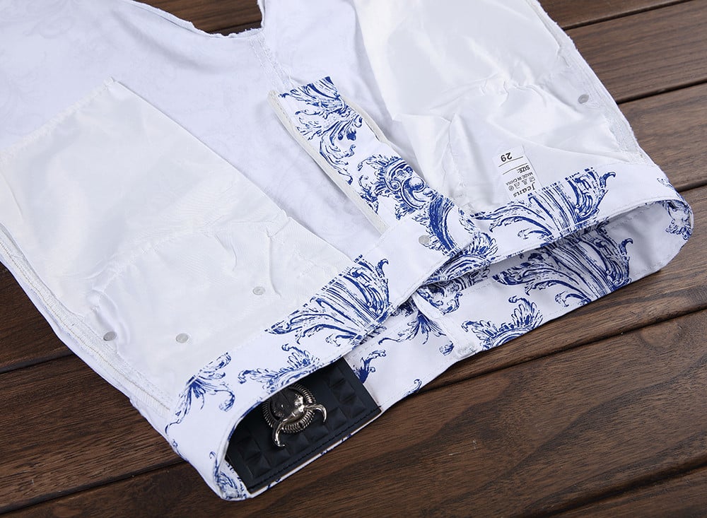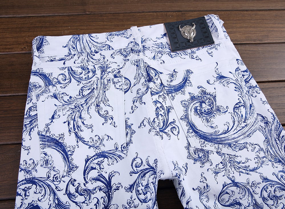 Jeans para hombre en azul y blanco con un diseño interesante.