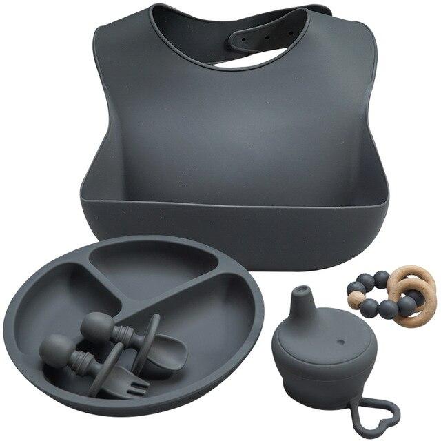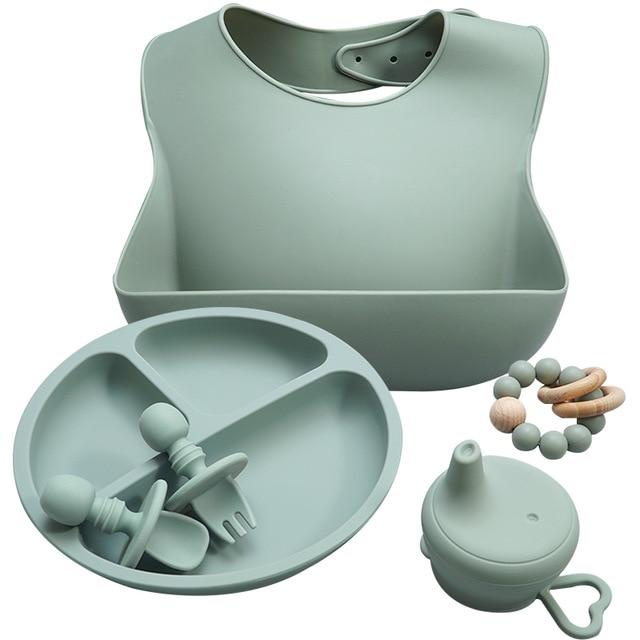 Set de alimentación para niños. El set incluye un babero, un plato, cubiertos y una taza para beber.