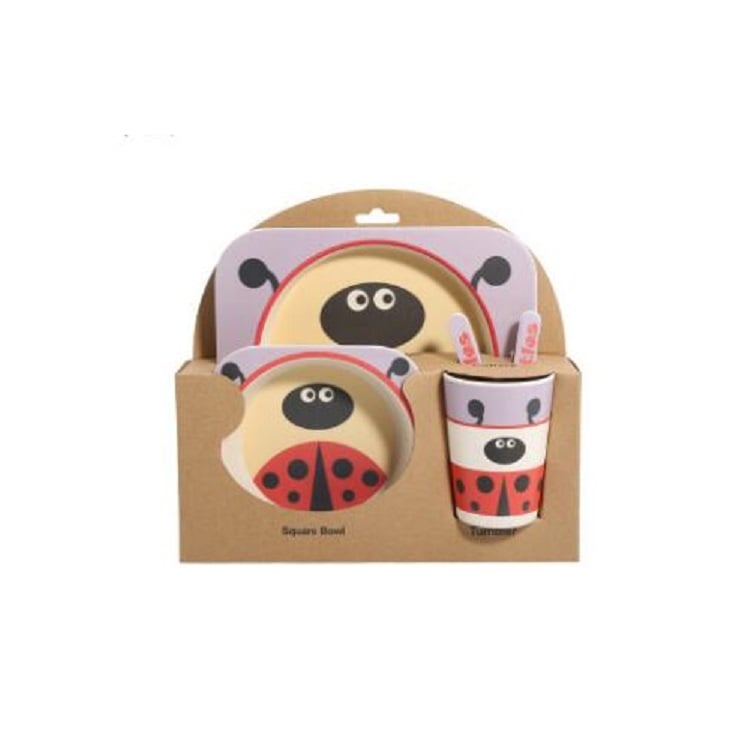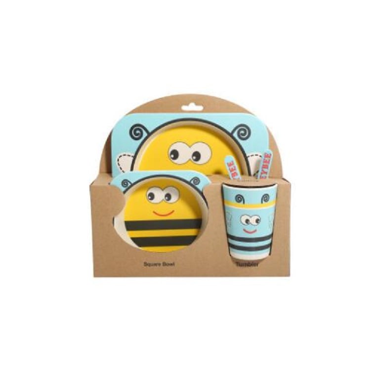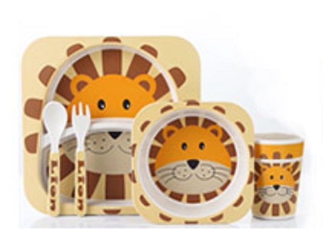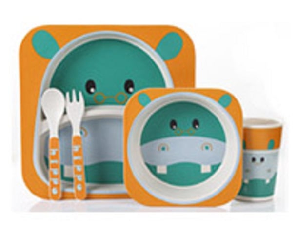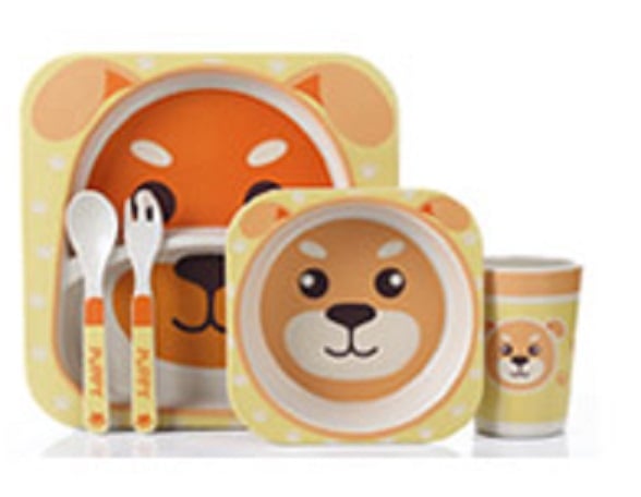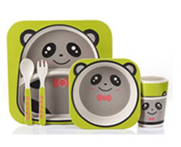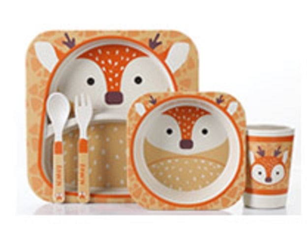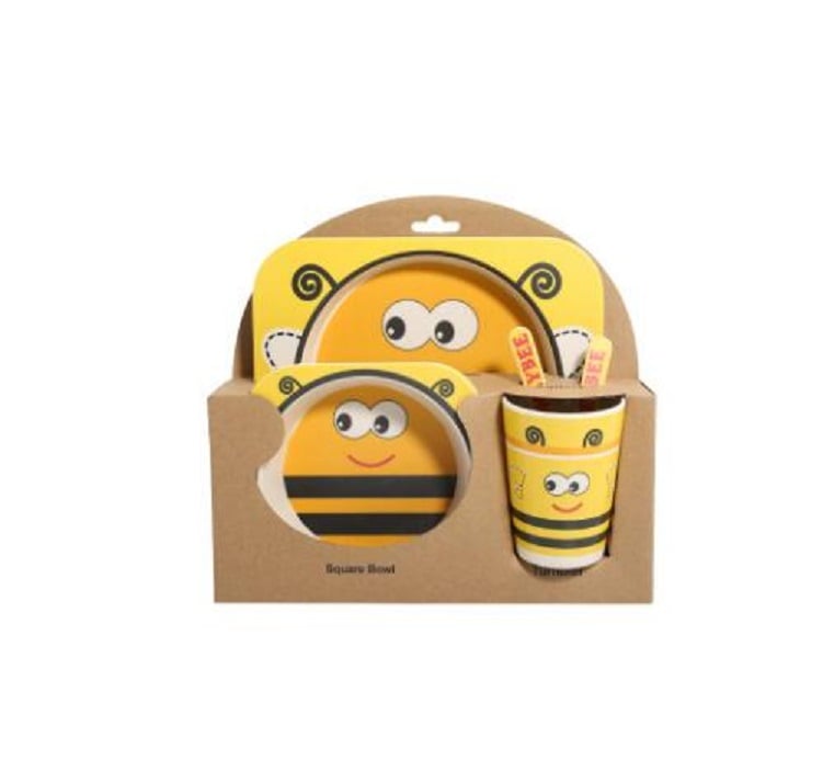 Este conjunto de comida para niños está hecho de fibra de bambú y consta de 5 piezas.