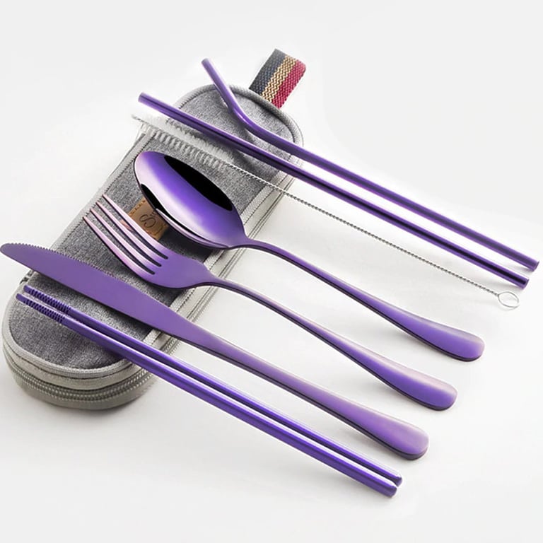Juego de cubiertos con un práctico estuche para complementar su cocina. Incluye un juego clásico de cubiertos y además palillos chinos, pajitas y un cepillo de limpieza.