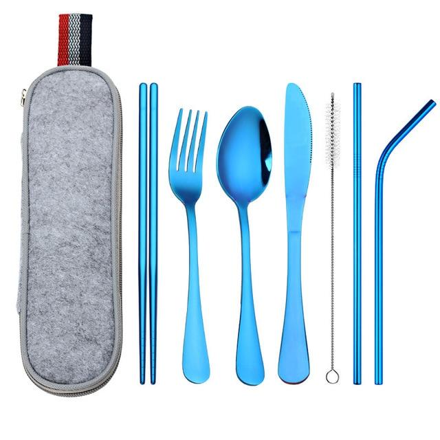 • El set incluye un tenedor, cuchara, cuchillo, pajita y además palillos chinos, así que si eres amante de la comida exótica, podrás disfrutarla con estilo incluso en tus viajes.