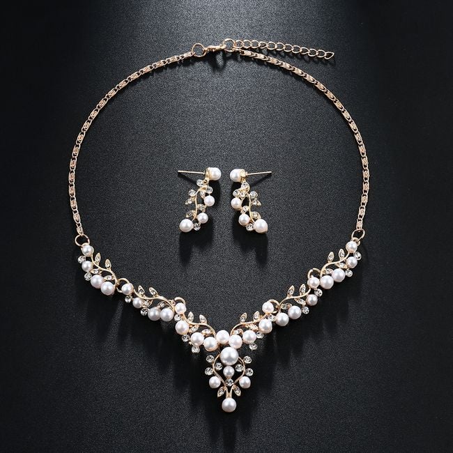 Hermoso conjunto de joyería de boda con piedras de bisutería y perlas en dos colores.