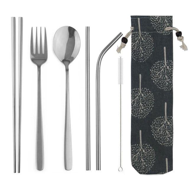 Set de utensilios de acero inoxidable en una práctica bolsa.