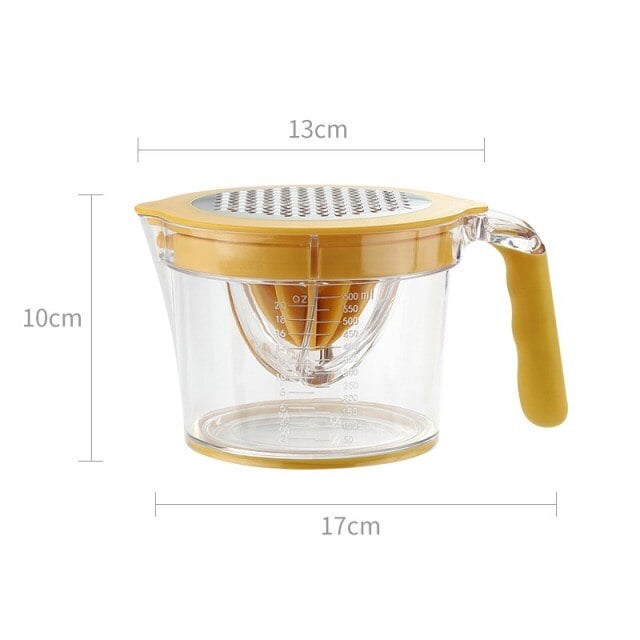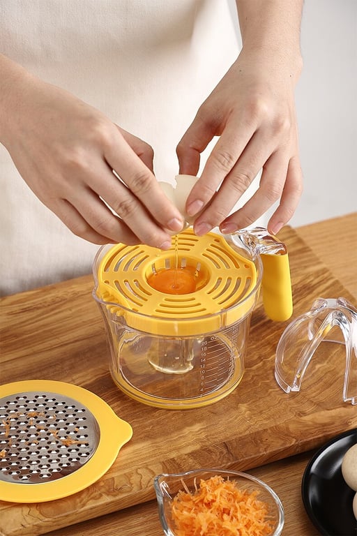 El juego incluye un rallador, un separador de claras y yemas y un exprimidor.