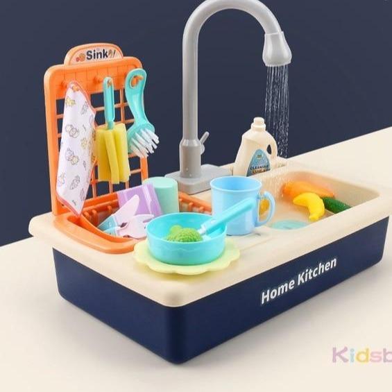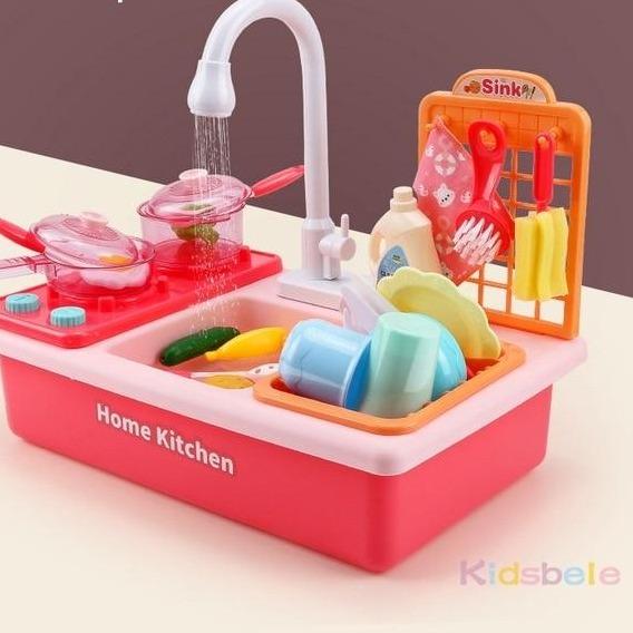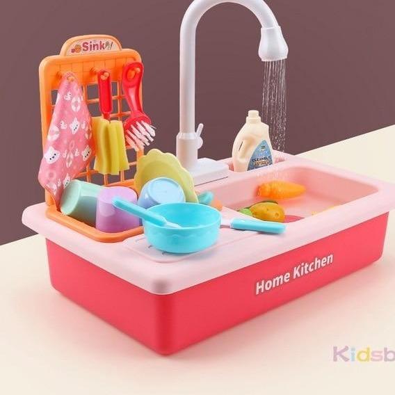 Fregadero de cocina de juguete con accesorios.