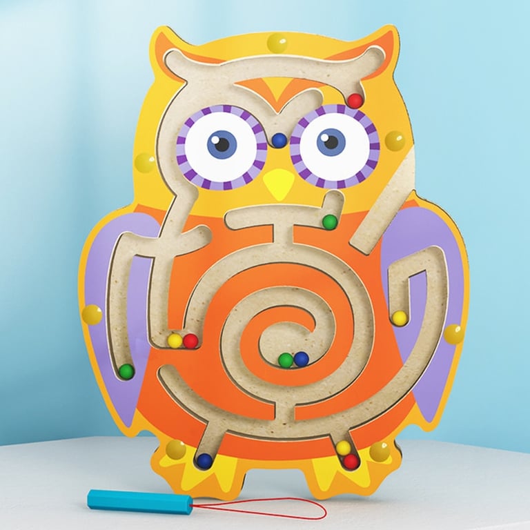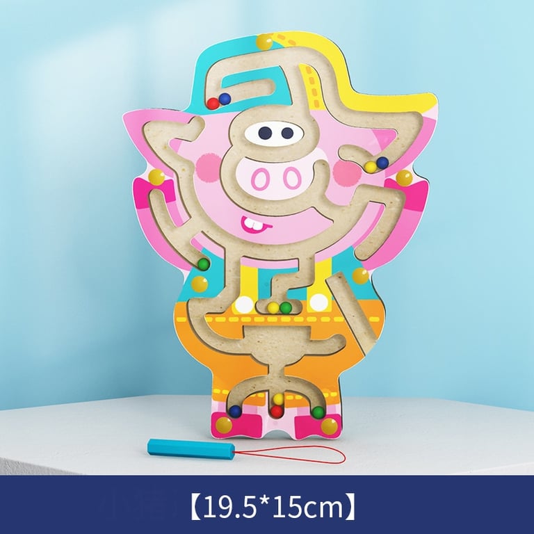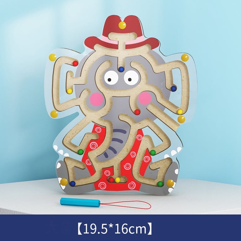 • Divertido juguete de laberinto de madera. Cada laberinto tiene la forma de un animal y contiene varias bolitas de colores que el niño debe llevar hasta la meta del laberinto con un lápiz magnético.