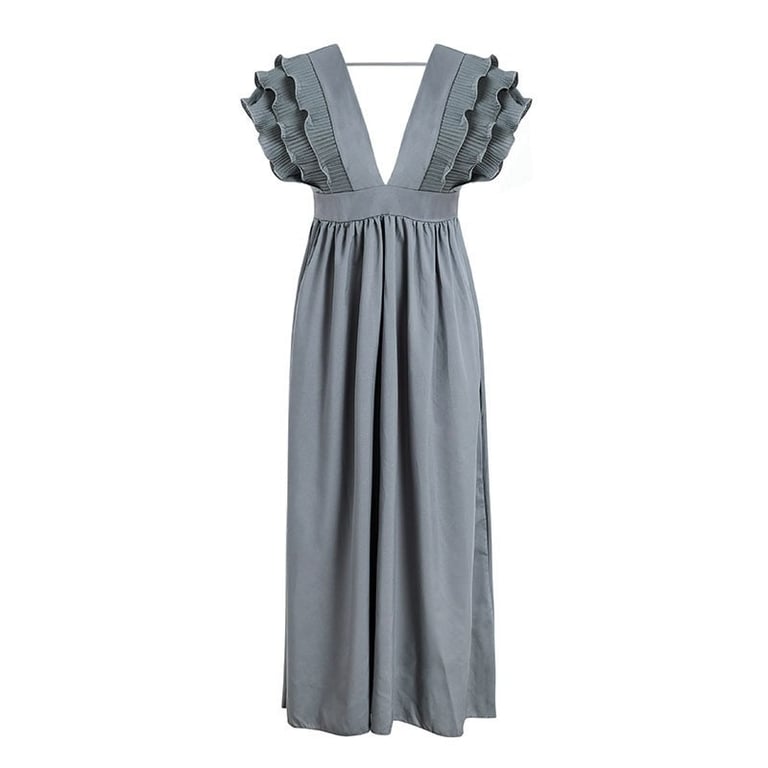 Vestido largo sin mangas para mujer decorado con volantes. Escote profundo y material agradable.