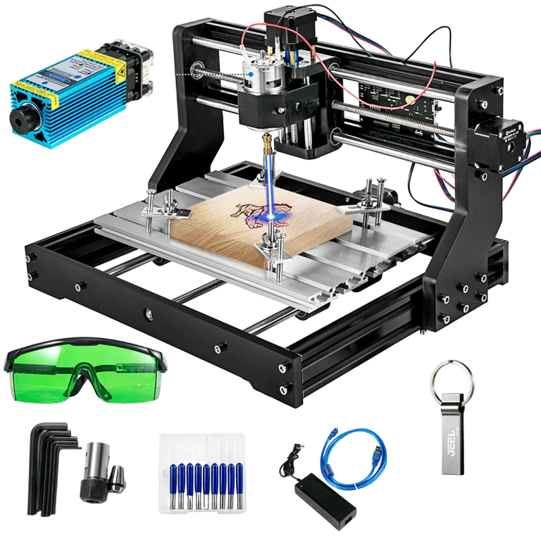 Contenido del paquete: 1x módulo láser, 1x husillo, 1x disco, 1x juego de fresas, 1x gafas de protección, 1x cable USB, 1x fuente de alimentación, 1x juego de herramientas, 1x cepillo