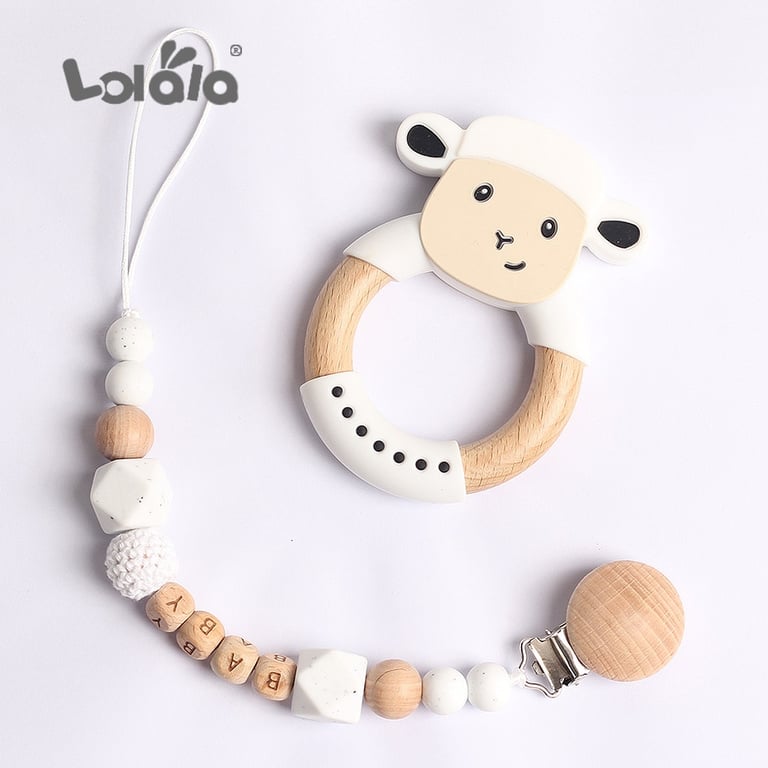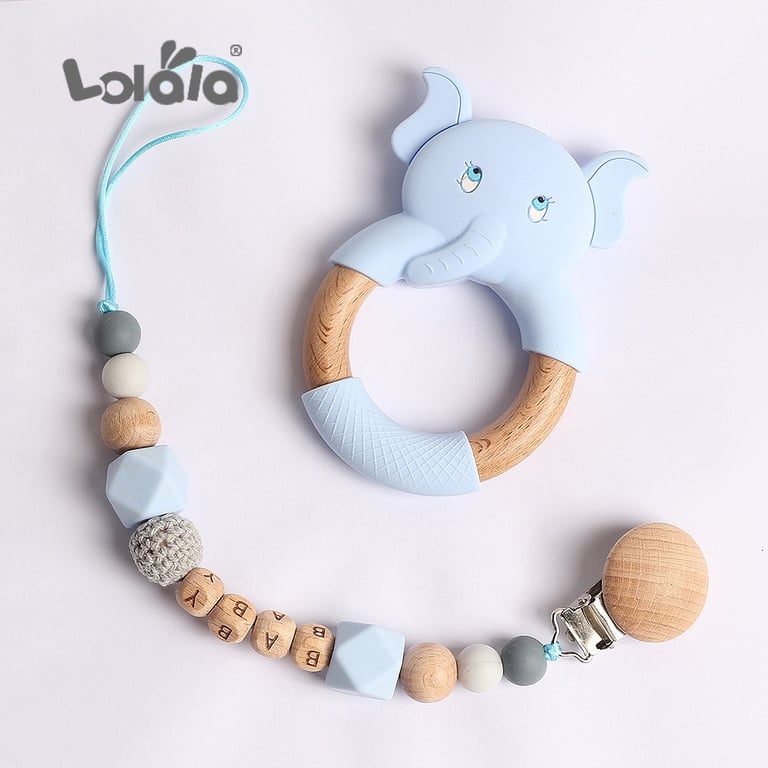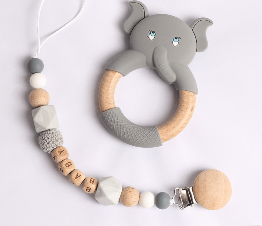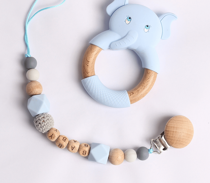 Clip para chupete en suaves colores pastel con detalles de madera y adorables animalitos.