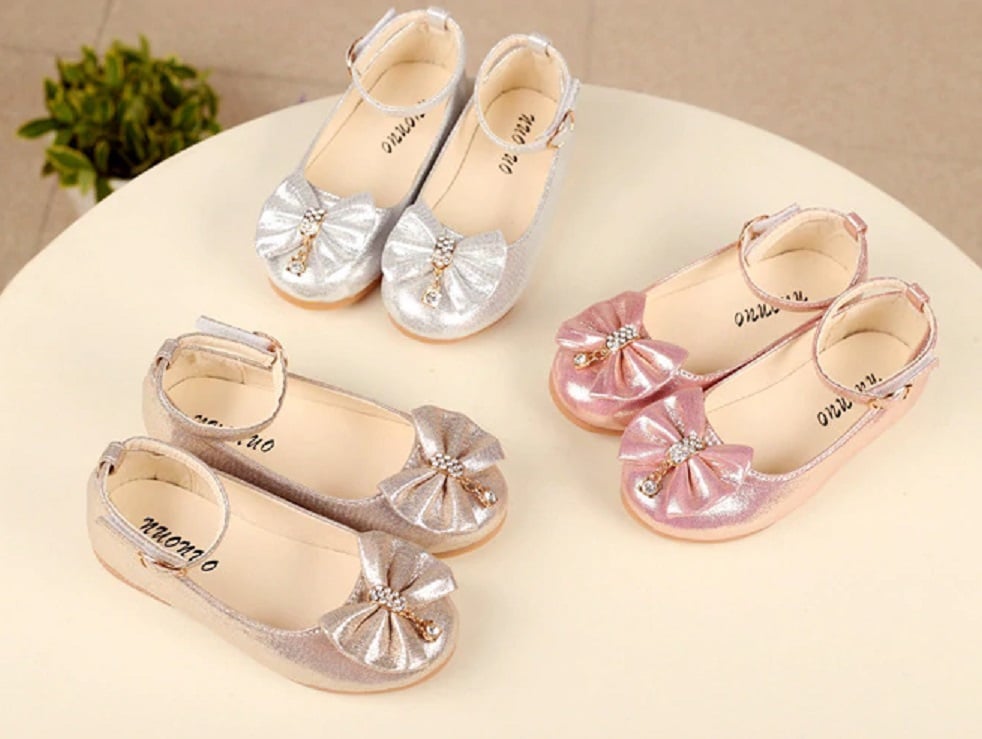 Las bailarinas son brillantes y en la parte delantera tienen un lazo decorado con piedras.