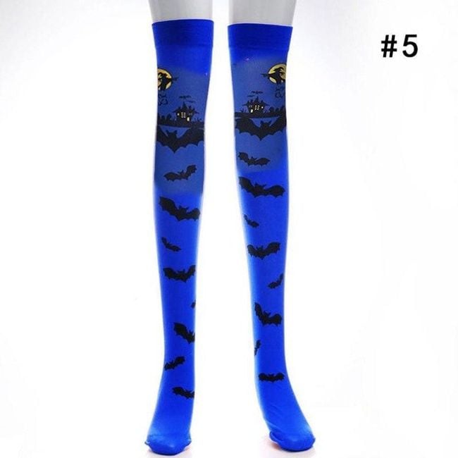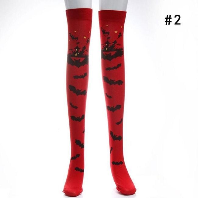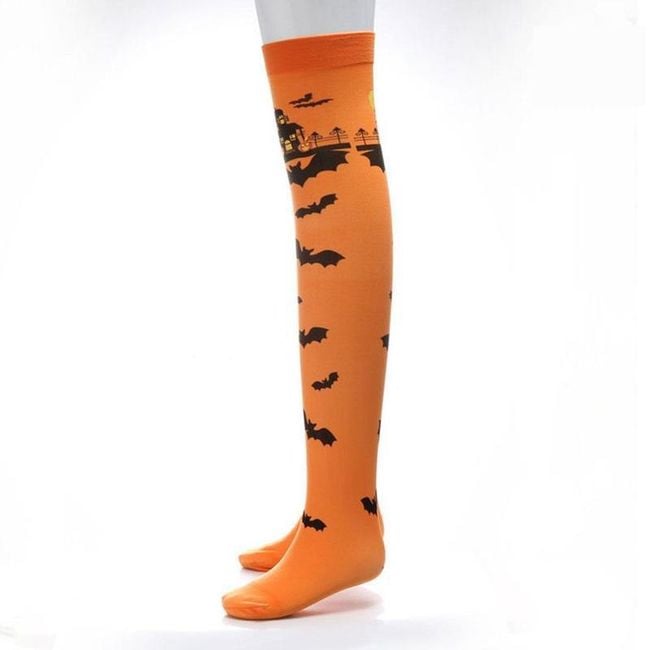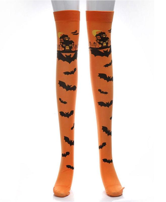 Las medias altas tienen un estampado de Halloween con murciélagos y una casa embrujada. Son perfectas para usar durante el otoño, el Día de los Muertos y también en Halloween mismo.