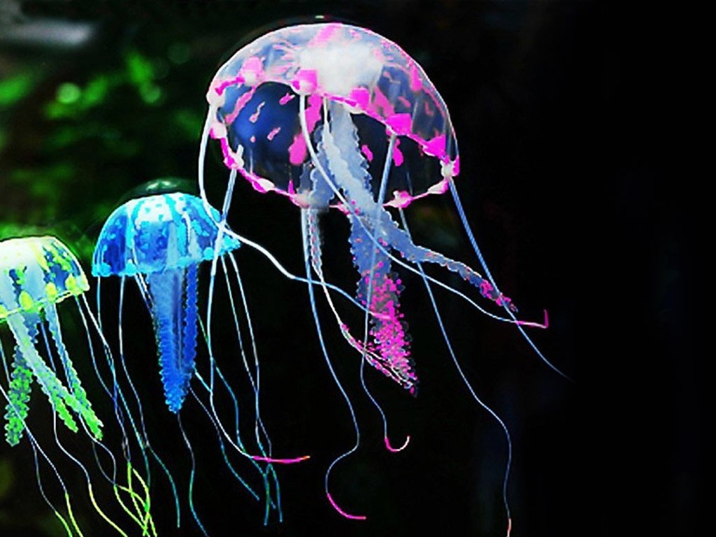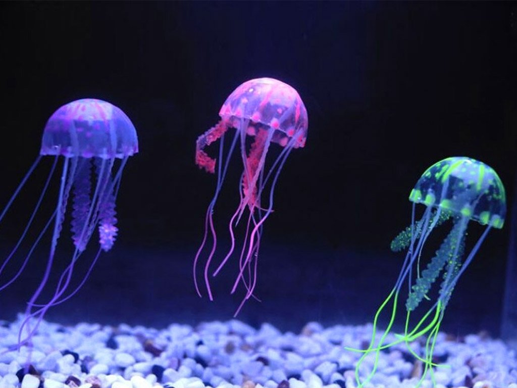 Las medusas están hechas de silicona suave y flotan naturalmente en el agua del acuario. Están cubiertas con un polvo luminiscente no tóxico que brilla en la oscuridad después de haber sido iluminado adecuadamente.