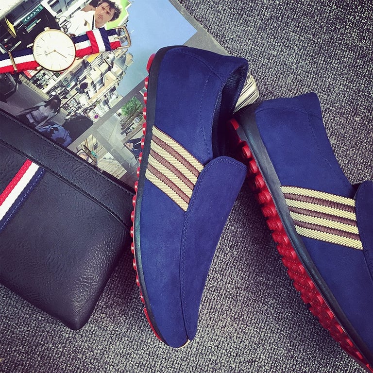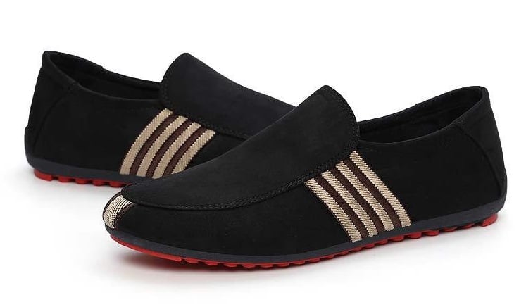 Los mocasines tienen una suela roja y están adornados con rayas.