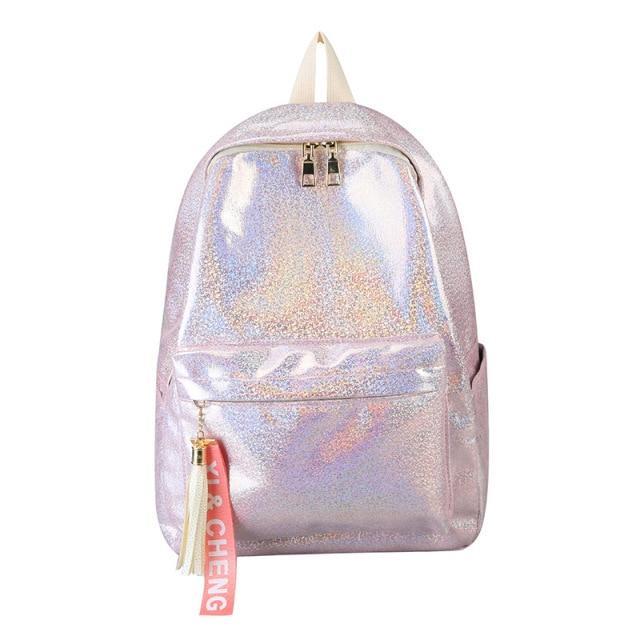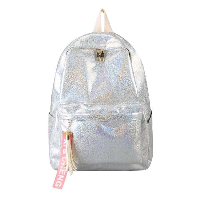 Mochila brillante, adecuada para la escuela. La mochila tiene un gran compartimento principal y un pequeño compartimento frontal. Disponible en tres colores.