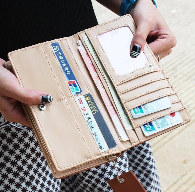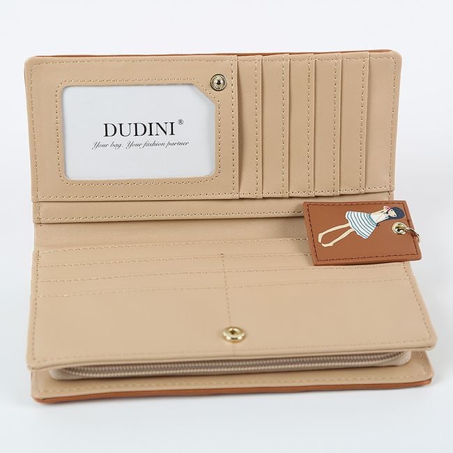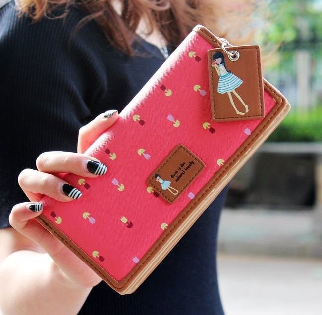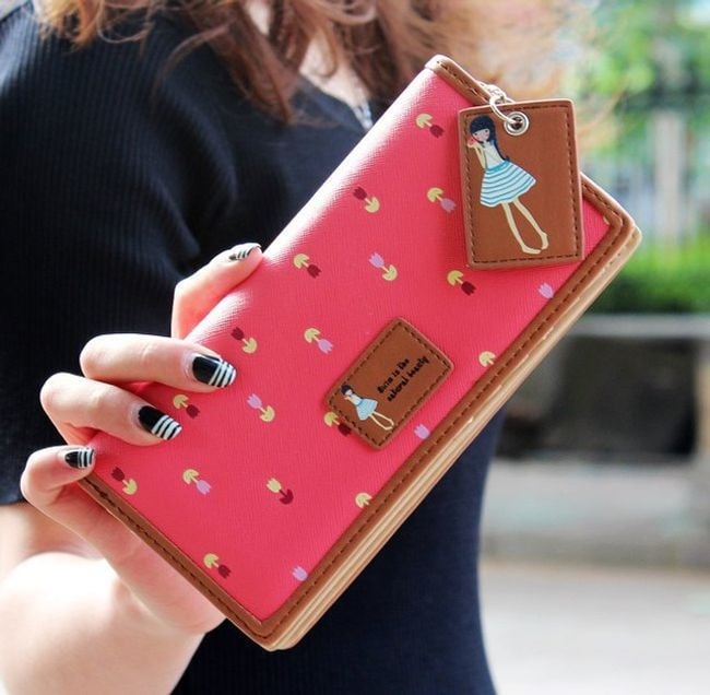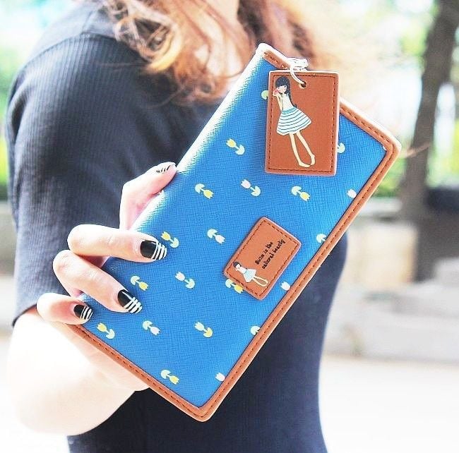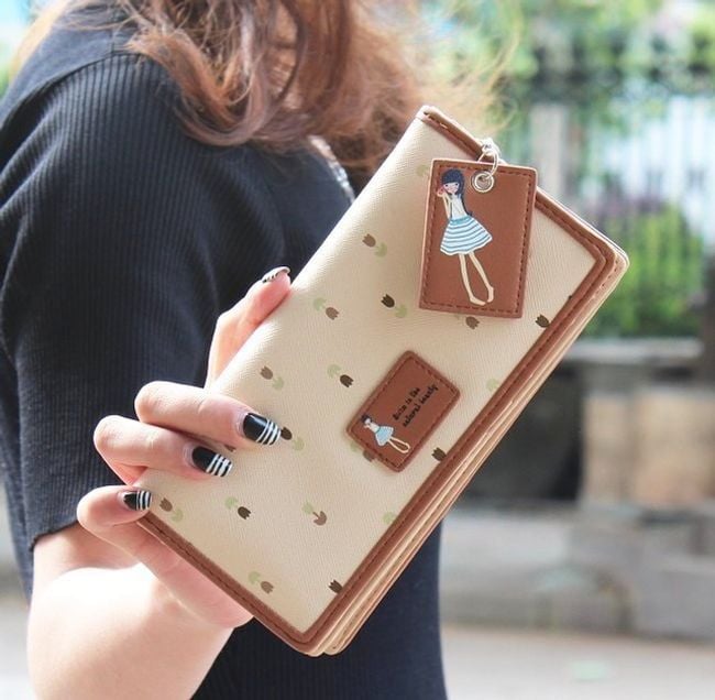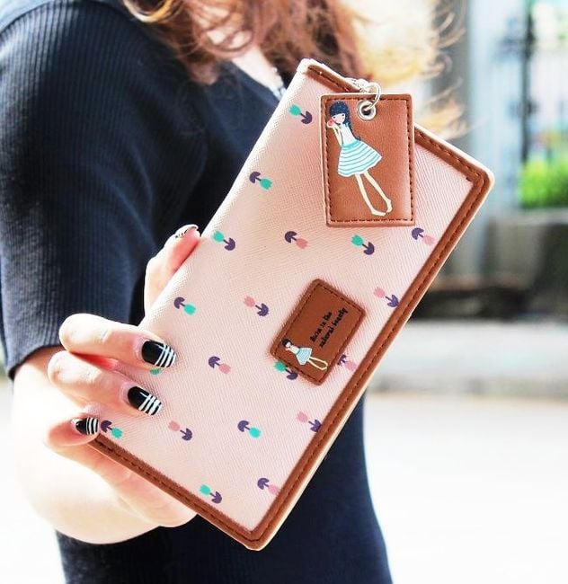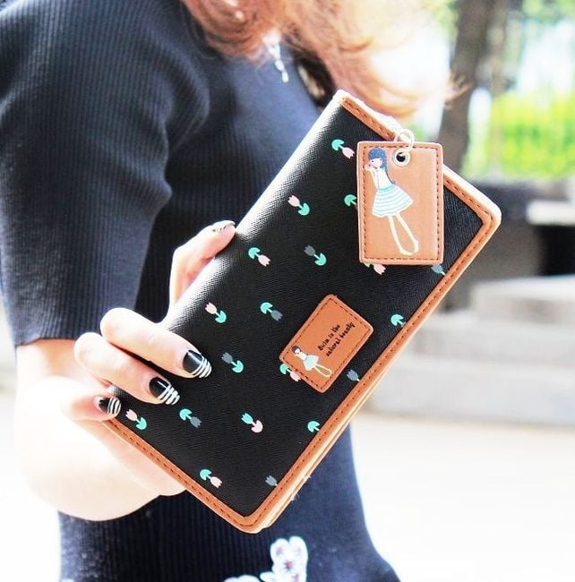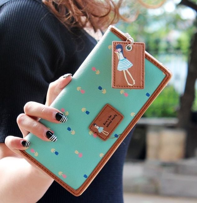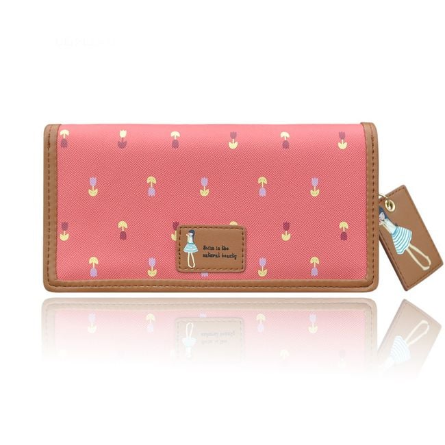 La espaciosa cartera con estampado de pequeños tulipanes de colores tiene un llavero con una muñeca colgado del zipper.