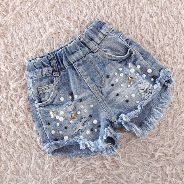 Shorts de mezclilla para niña con cintura elástica y piernas decoradas. Los extremos de las piernas tienen un aspecto desgastado y a la moda.