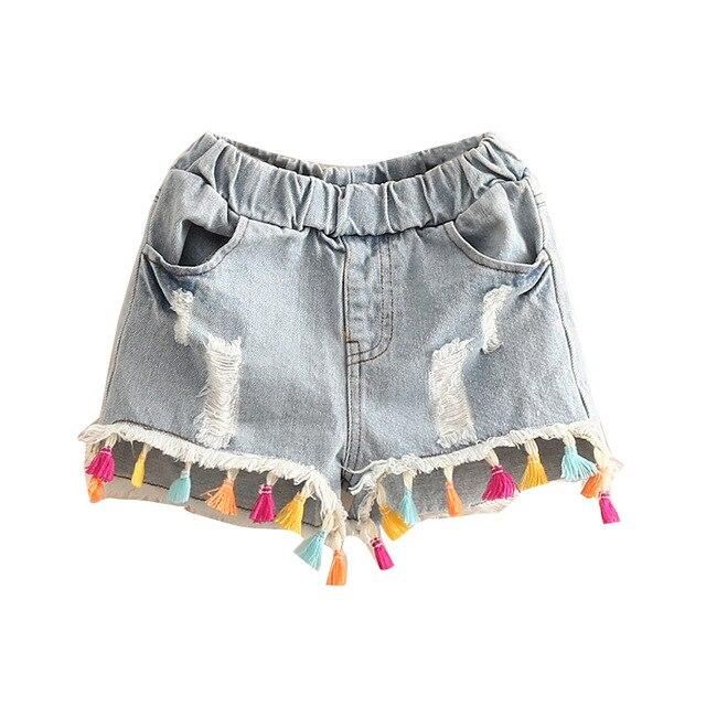 Divertidos pantalones cortos adornados con flecos de colores en los extremos de las perneras. Los pantalones cortos están hechos de un material de algodón de alta calidad.