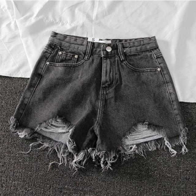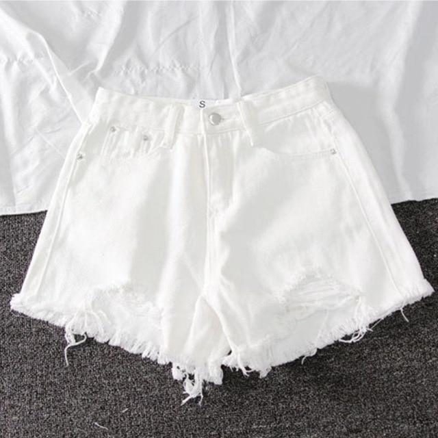 Shorts de mezclilla de moda con cintura alta. Los shorts son de estilo desgastado. Disponibles en colores negro, gris, azul o blanco.