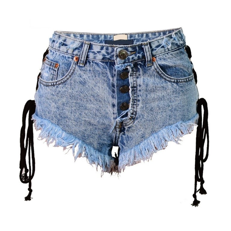 Estos elegantes pantalones cortos de mezclilla deshilachados con cordones negros son realmente una bomba para el verano.