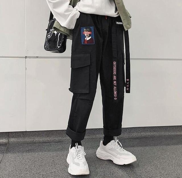 Los pantalones tienen grandes bolsillos tipo cargo cubiertos con solapa y cordones en la cintura. El cinturón decorativo está libremente pasado por el lazo y se puede quitar.